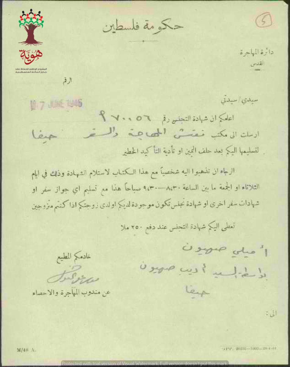 رسالة من مندوب المهاجرة والإحصاء الى اميلي صهيون للحصول على شهادة الجنسية الفلسطينية