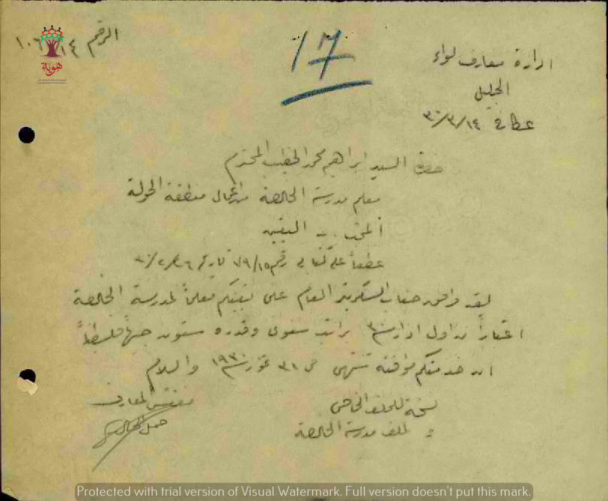 مجموعة رسائل بخصوص تعيين المعلم ابراهيم محمد الخطيب في مدرسة الخالصة