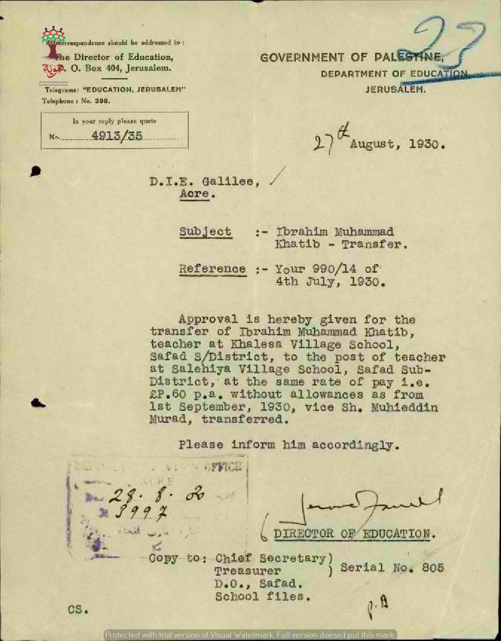 رسالة من مدير المعارف الى مفتش المعارف يوافق فيها على نقله من مدرسة الخالصة الى مدرسة الصالحية