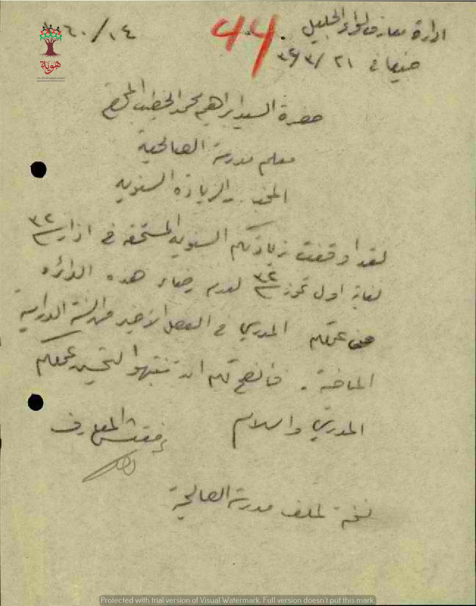 رسالة من مفتش المعارف الى المعلم ابراهيم الخطيب بخصوص ايقاف زيادة راتبه بسبب نتائج عمله الغير مرضية