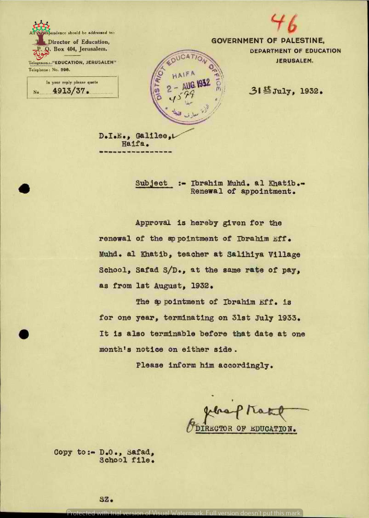 رسائل بخصوص الموافقة على تجديد تعيين المعلم ابراهيم الخطيب