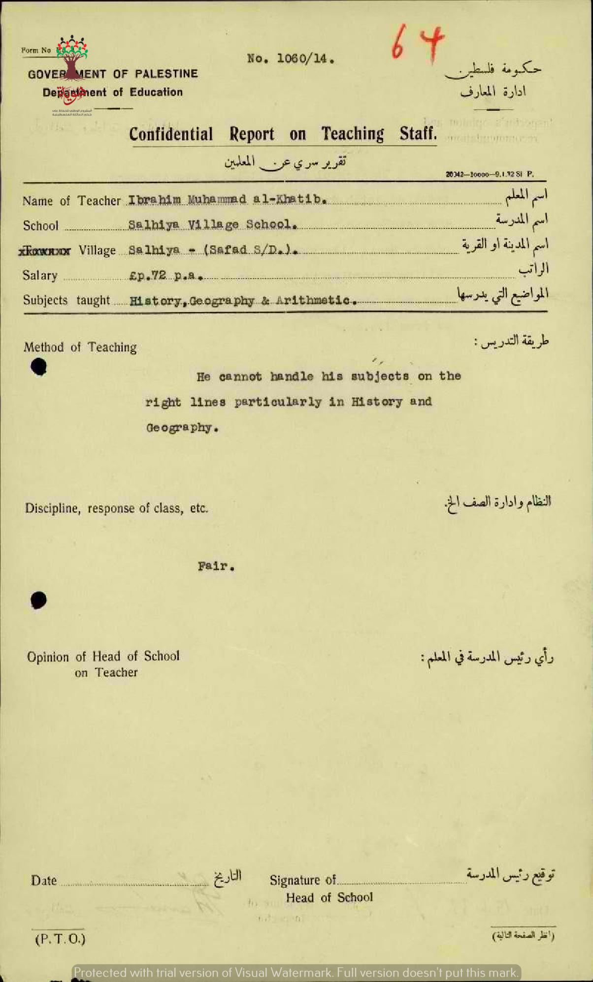 تقرير تفصيلي عن أداء المعلم ابراهيم محمد الخطيب في مدرسة الصالحية سنة 1933