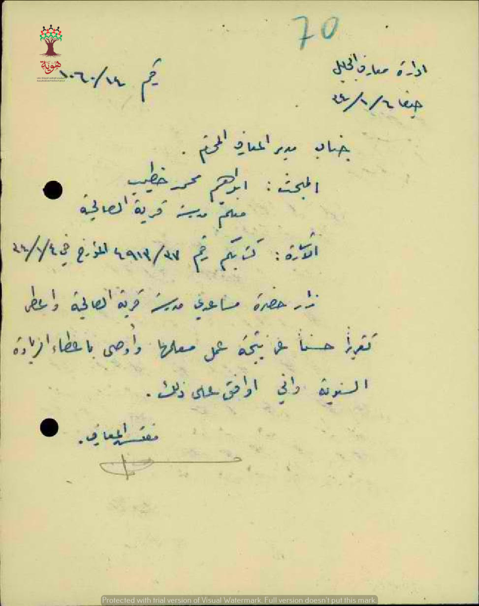 رسالة من مفتش المعارف الى مدير المعارف بخصوص تحسن أداء المعلم ابراهيم الخطيب