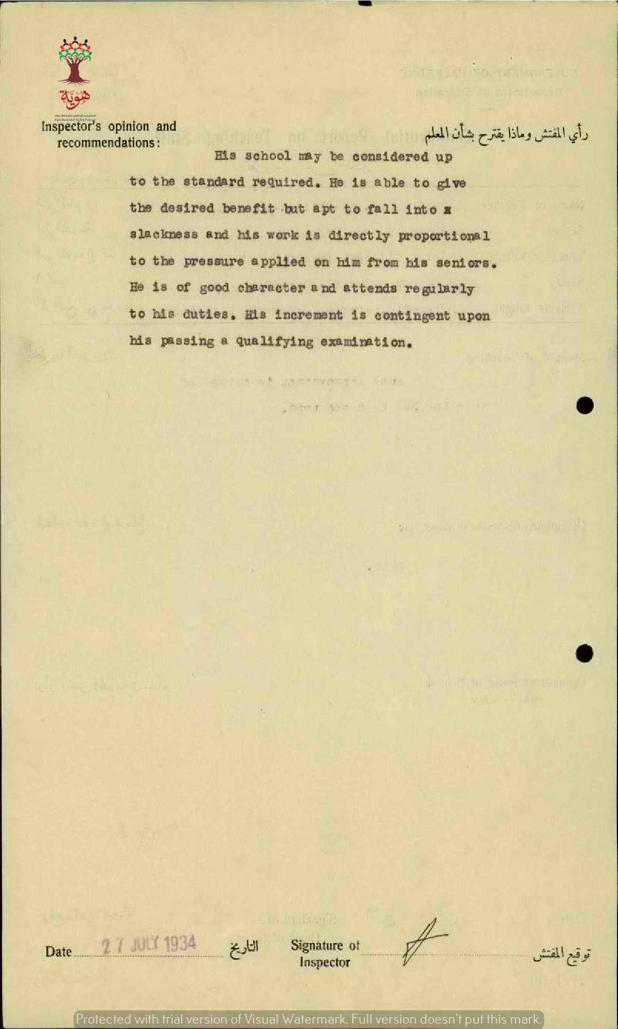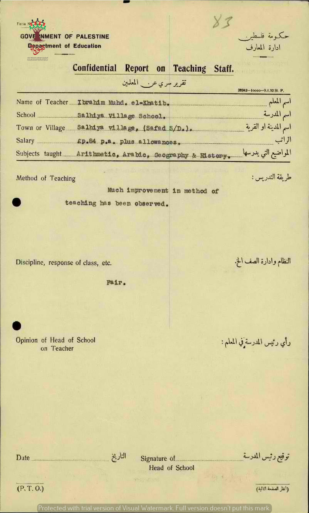 تقرير تفصيلي عن أداء المعلم ابراهيم محمد الخطيب في مدرسة الصالحية سنة 1934