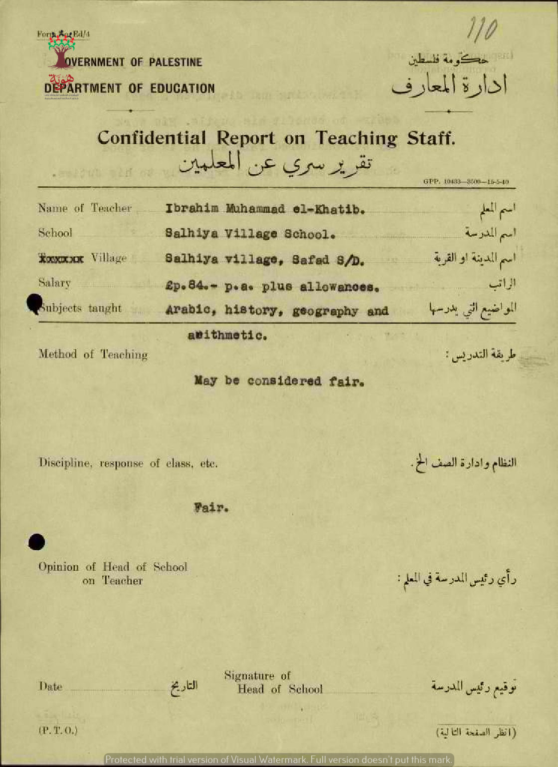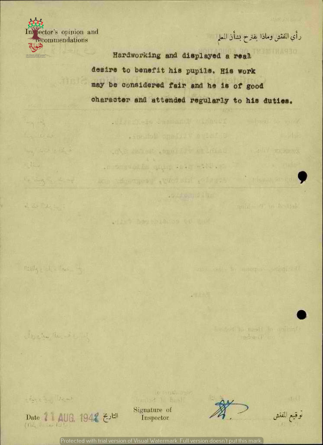 تقرير تفصيلي عن أداء المعلم ابراهيم محمد الخطيب في مدرسة الصالحية سنة 1942