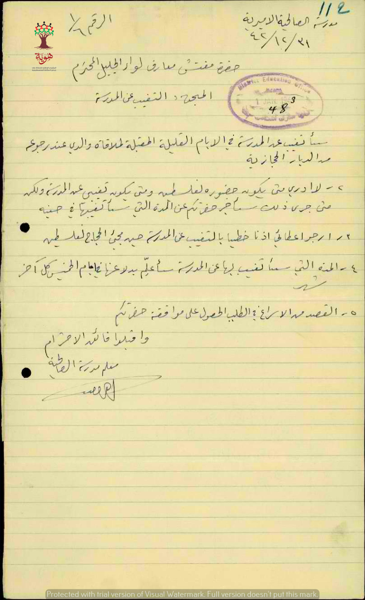 رسالة من المعلم ابراهيم الخطيب الى مفتش المعارف يطلب اذن بالتغيب