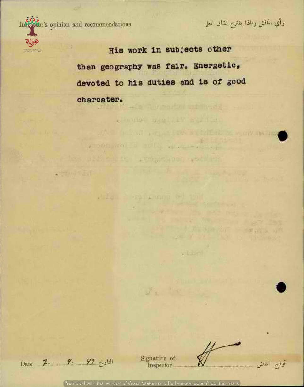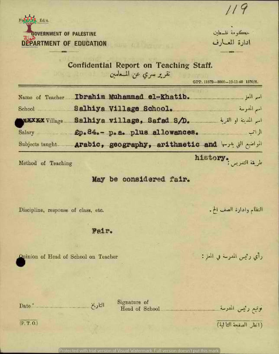 تقرير تفصيلي عن أداء المعلم ابراهيم محمد الخطيب في مدرسة الصالحية سنة 1943