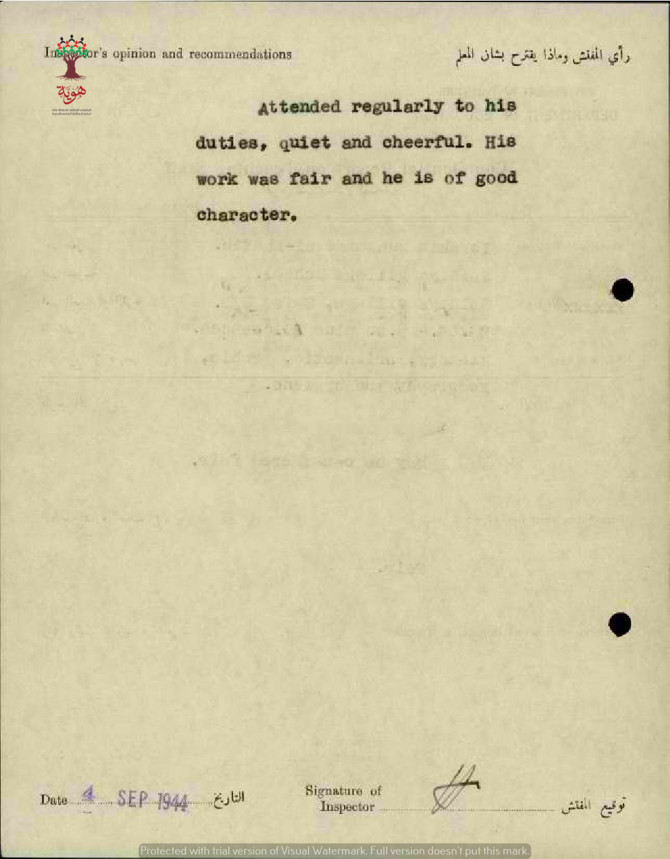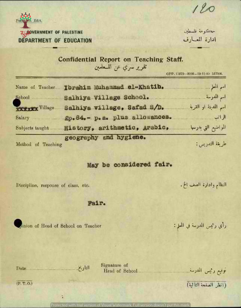 تقرير تفصيلي عن أداء المعلم ابراهيم محمد الخطيب في مدرسة الصالحية سنة 1944