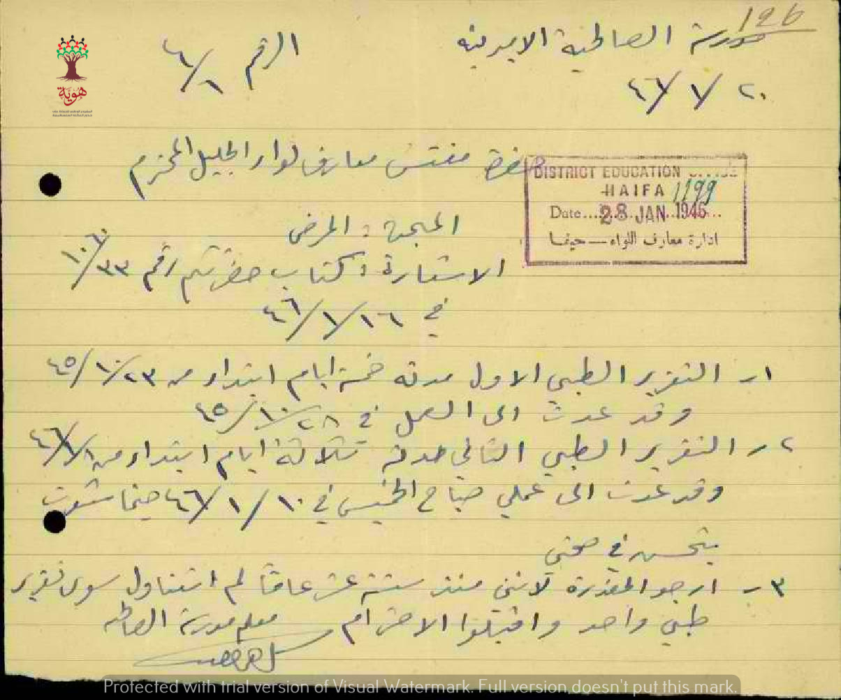 رسالة من المعلم ابراهيم الخطيب الى مفتش المعارف بخصوص مدة تغيبه