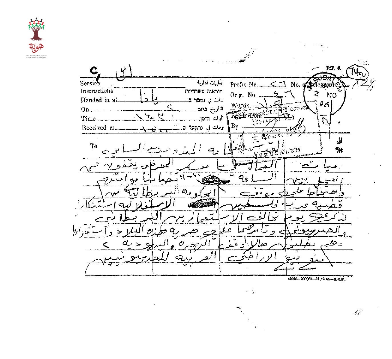 تلغراف مرسل من عمال معسكر يافا الى المندوب السامي احتجاجا على وعد بلفور