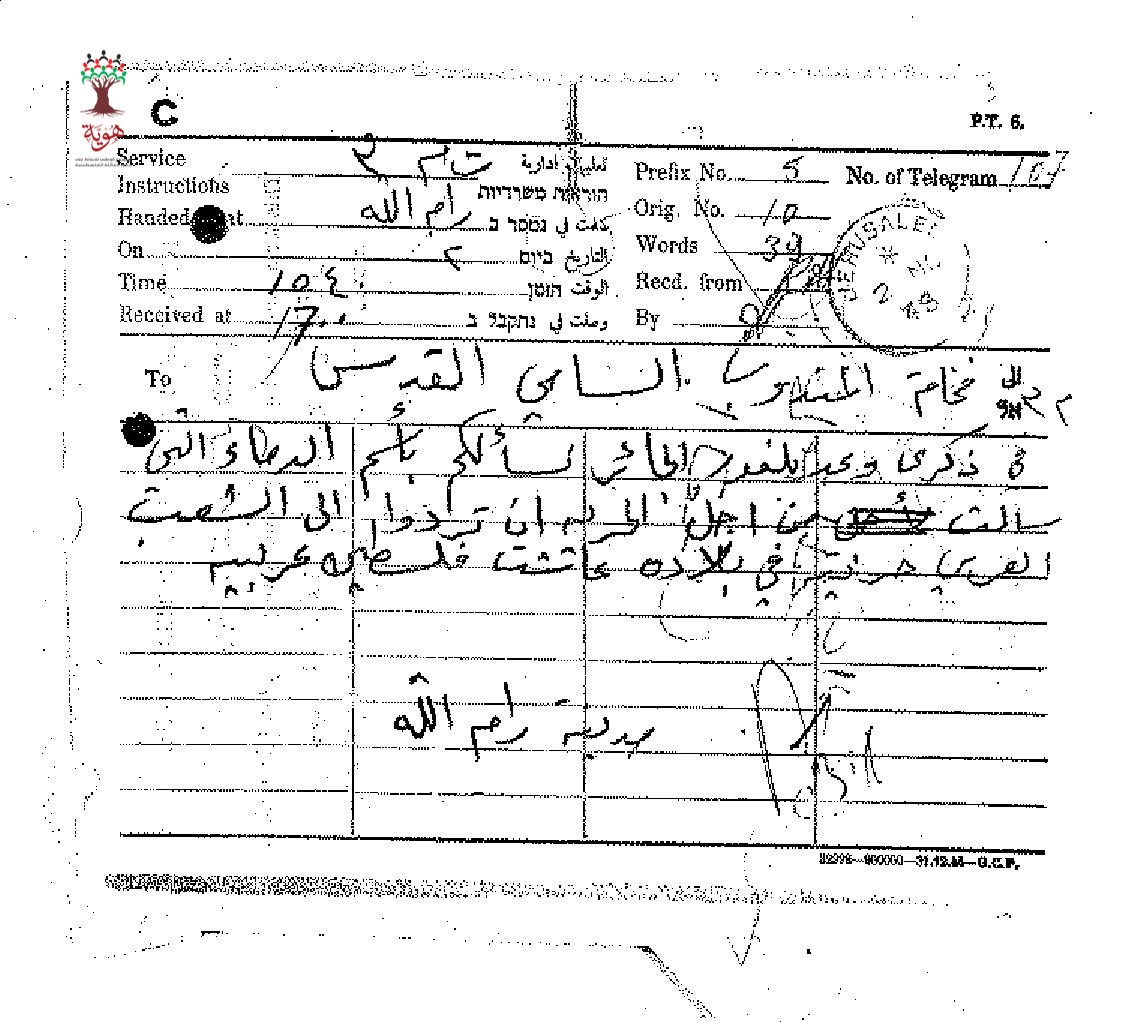تلغراف مرسل من اهالي مدينة رام الله الى المندوب السامي احتجاجا على وعد بلفور مطالبين برد الحق الى اهله