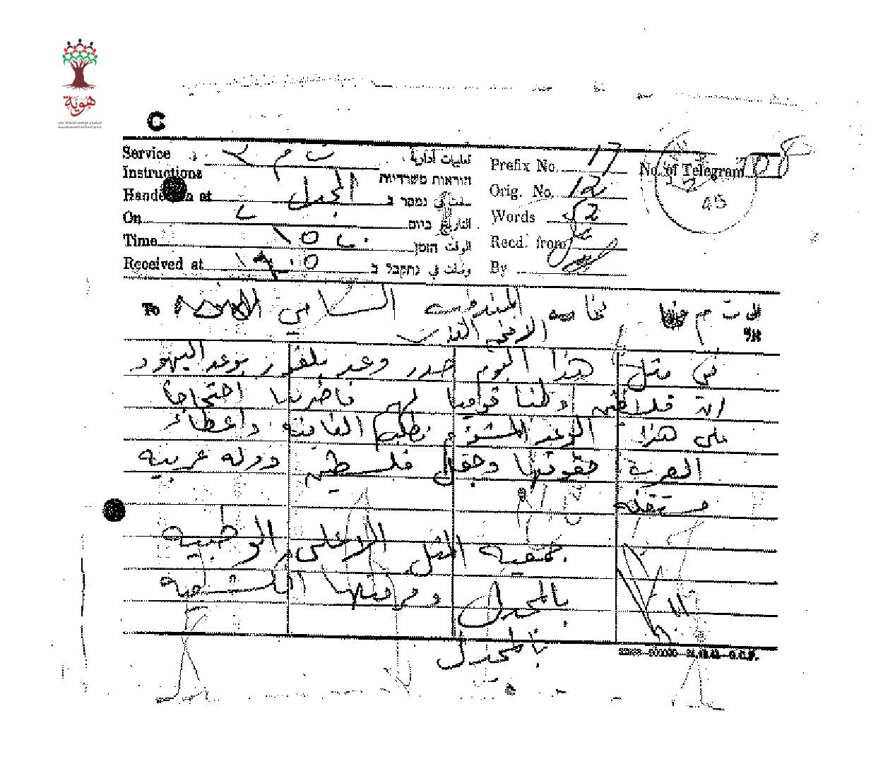 تلغراف مرسل من جمعية المثل الأعلى الوطنية بالمجدل الى المندوب السامي احتجاجا على وعد بلفور