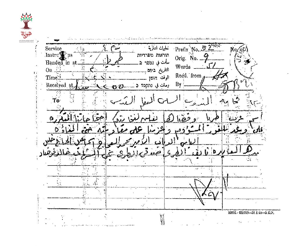 تلغراف مرسل من عرب طبريا الى المندوب السامي احتجاجا على وعد بلفور