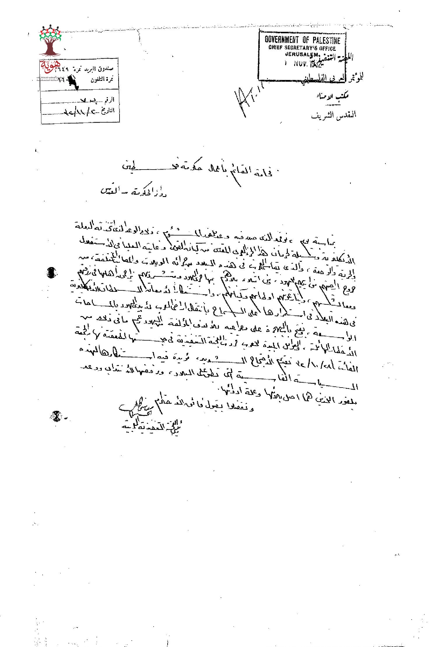 رسالة من اللجنة التنفيذية للمؤتمر العربي الفلسطيني في القدس الى المندوب السامي احتجاجا على وعد بلفور وعلى السماح بانتقال الأراضي لليهود وفتح باب الهجرة لهم.
