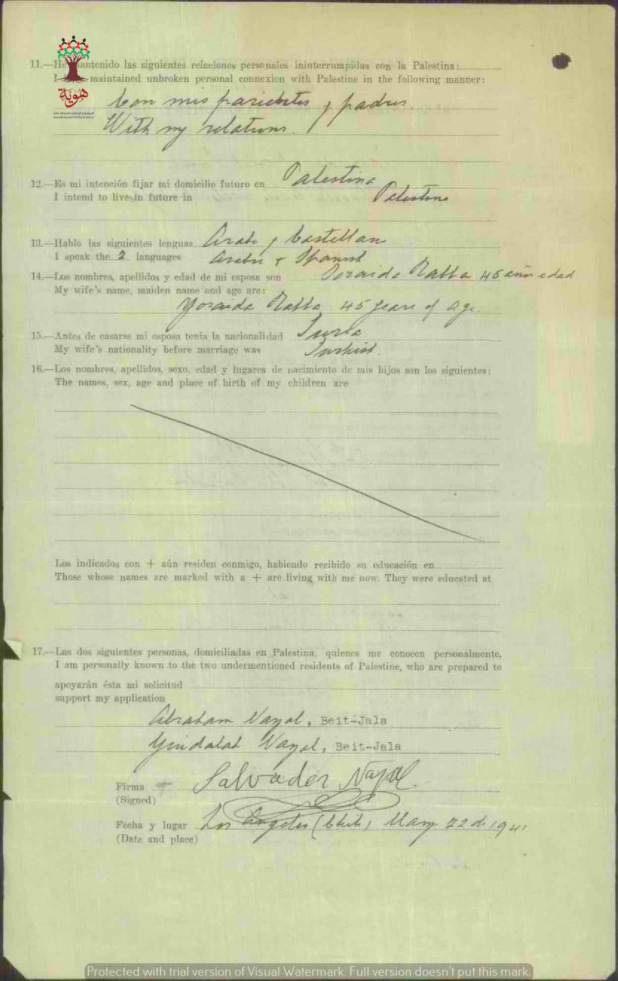 طلب الجنسية الفلسطينية-سلفادور نزال-بيت جالا/تشيلي