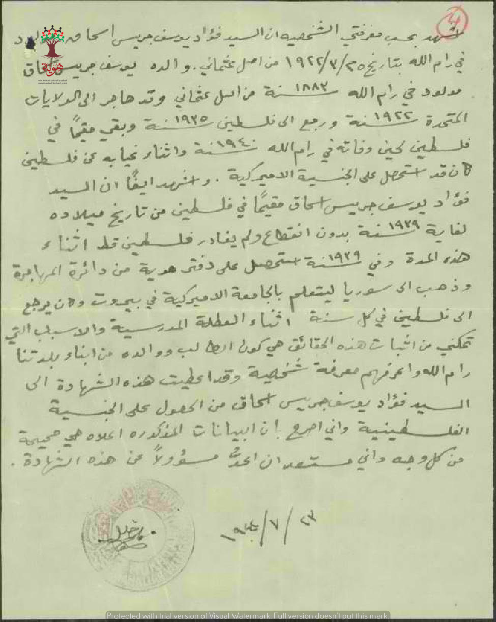 حيث يشهد بأن فؤاد إسحق قد ولد في رام الله وأن والده جريس مواليد رام الله أيضا سنة 1883 من أصل عثماني وهاجر الى الولايات المتحدة سنة 1922 وعاد الى فلسطين سنة 1935.