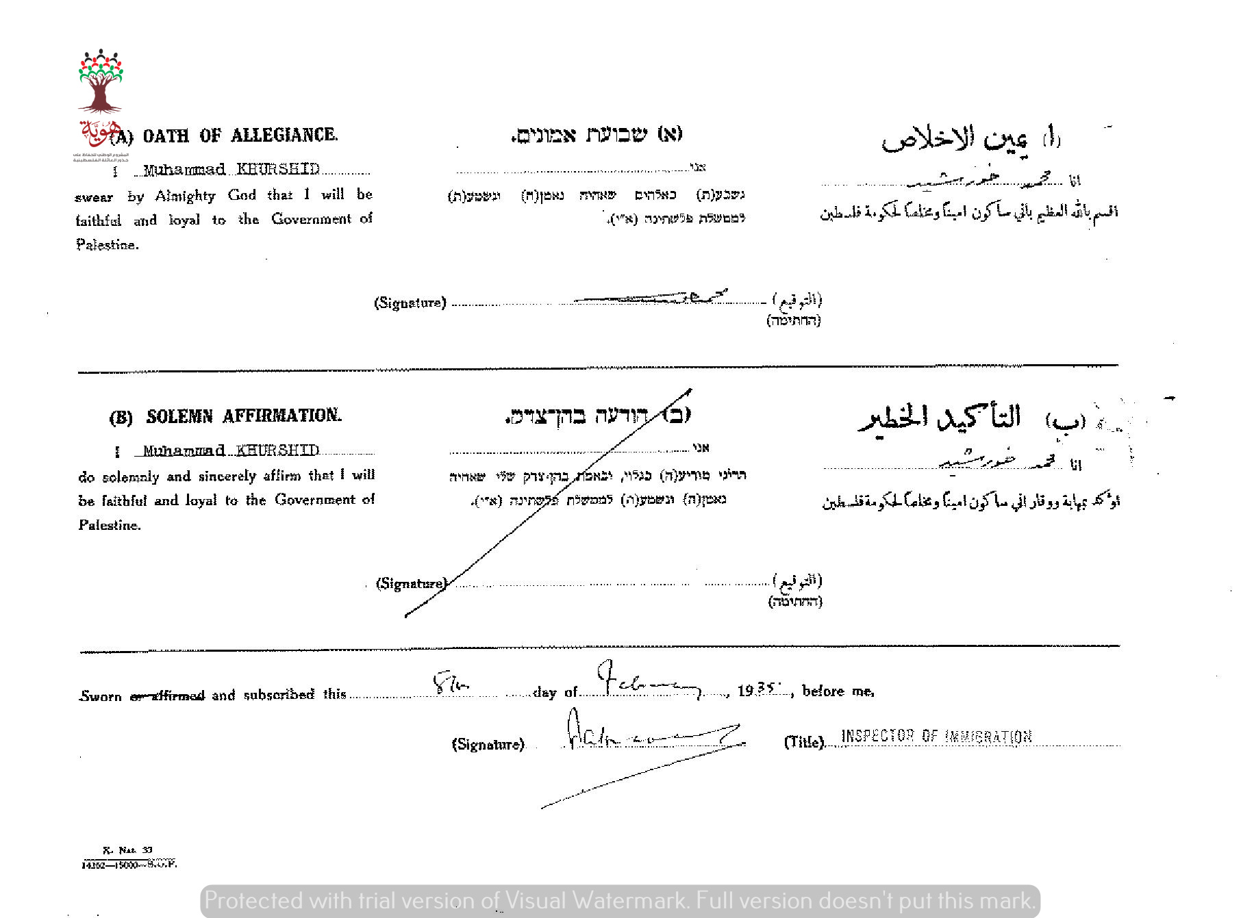 محمد خورشيد يوقع على (يمين الإخلاص) للحصول على الجنسية الفلسطينية