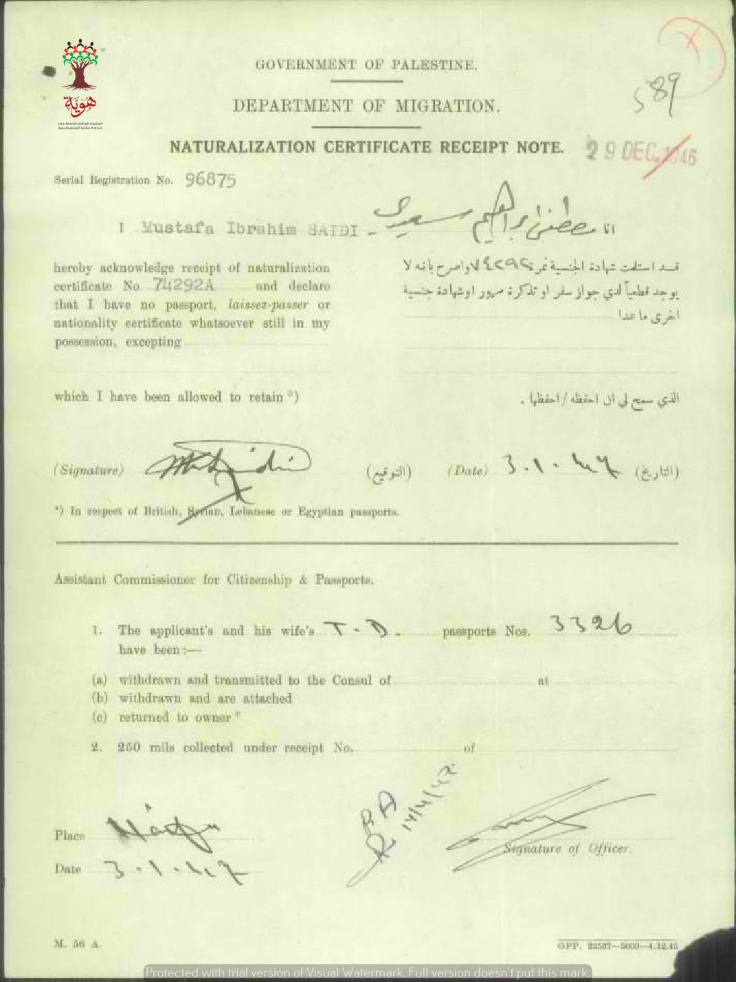 إيصال موقع من مصطفى السعيدي باستلام شهادة الجنسية الفلسطينية