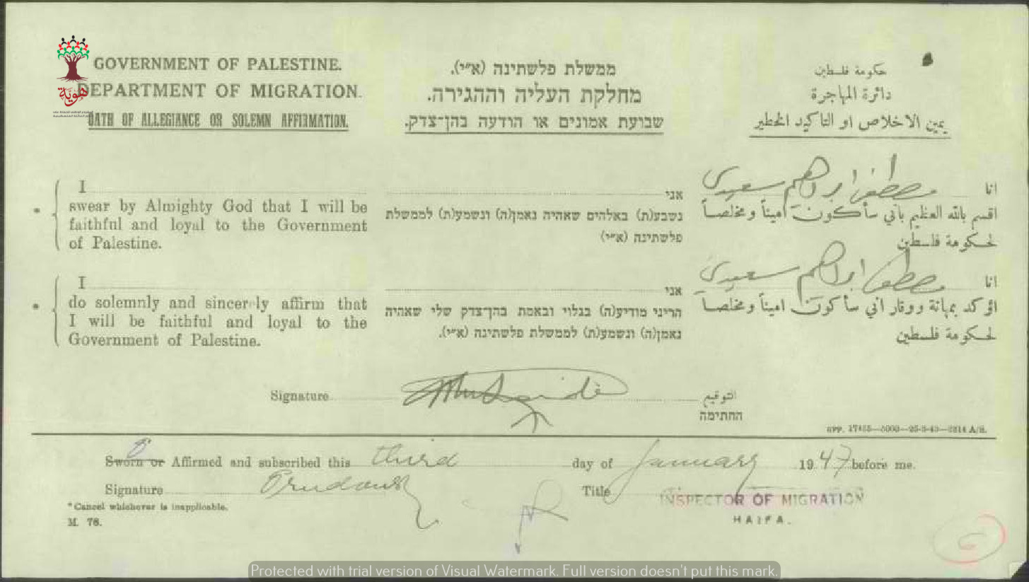 مصطفى إبراهيم سعيدي يوقع على (يمين الإخلاص) للحصول على الجنسية الفلسطينية