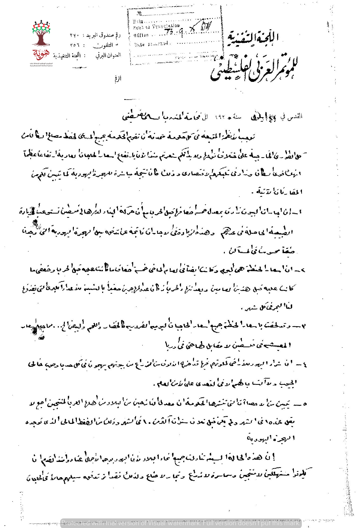 رسالة احتجاج من المؤتمر العربي الفلسطيني الى المندوب السامي احتجاجا على هجرة اليهود الى فلسطين