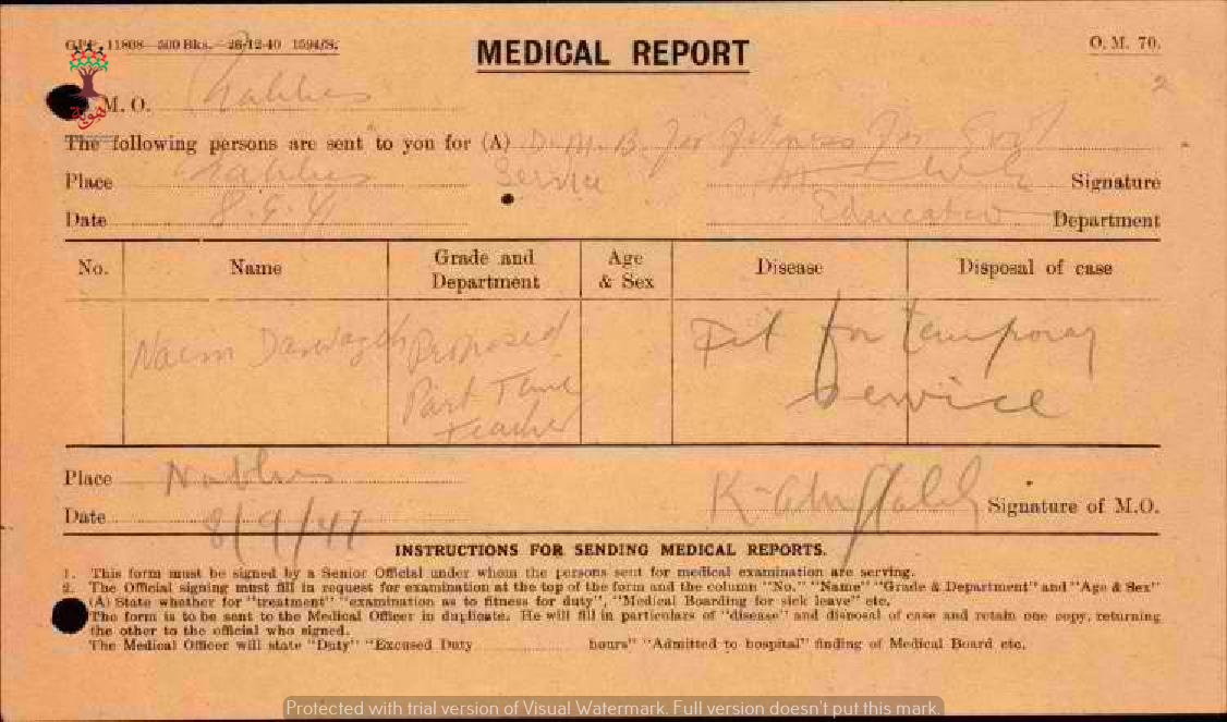 تقرير طبي لتعيين المعلم نعيم دروزة في مدرسة الطيرة
