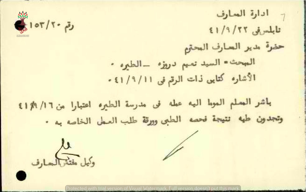 رسالة من وكيل مفتش المعارف الى مفتش المعارف يخبره بأن المعلم نعيم دروزة قد باشر عمله