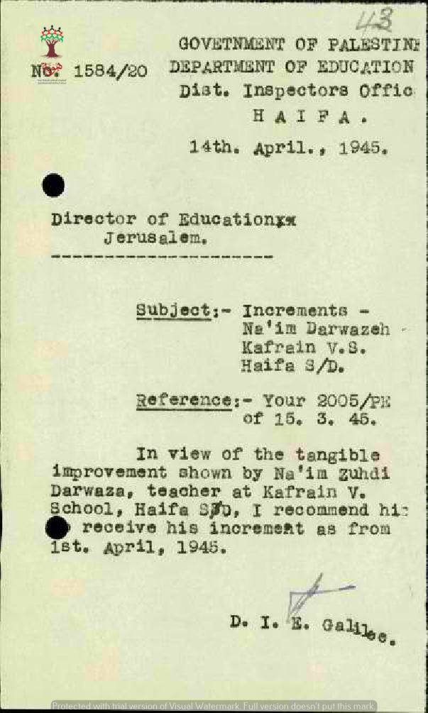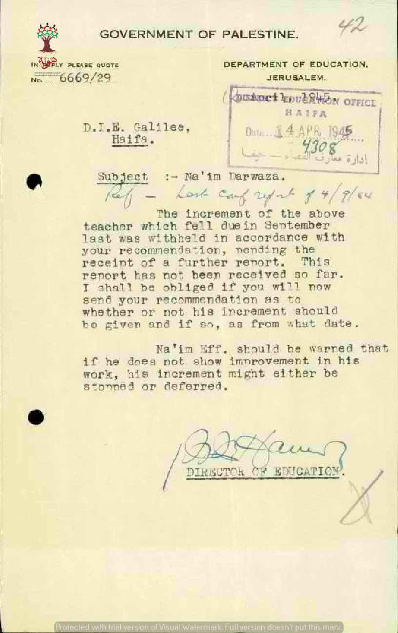 رسائل بخصوص اقرار زيادة راتب المعلم نعيم دروزة بسبب تحسن أدائه