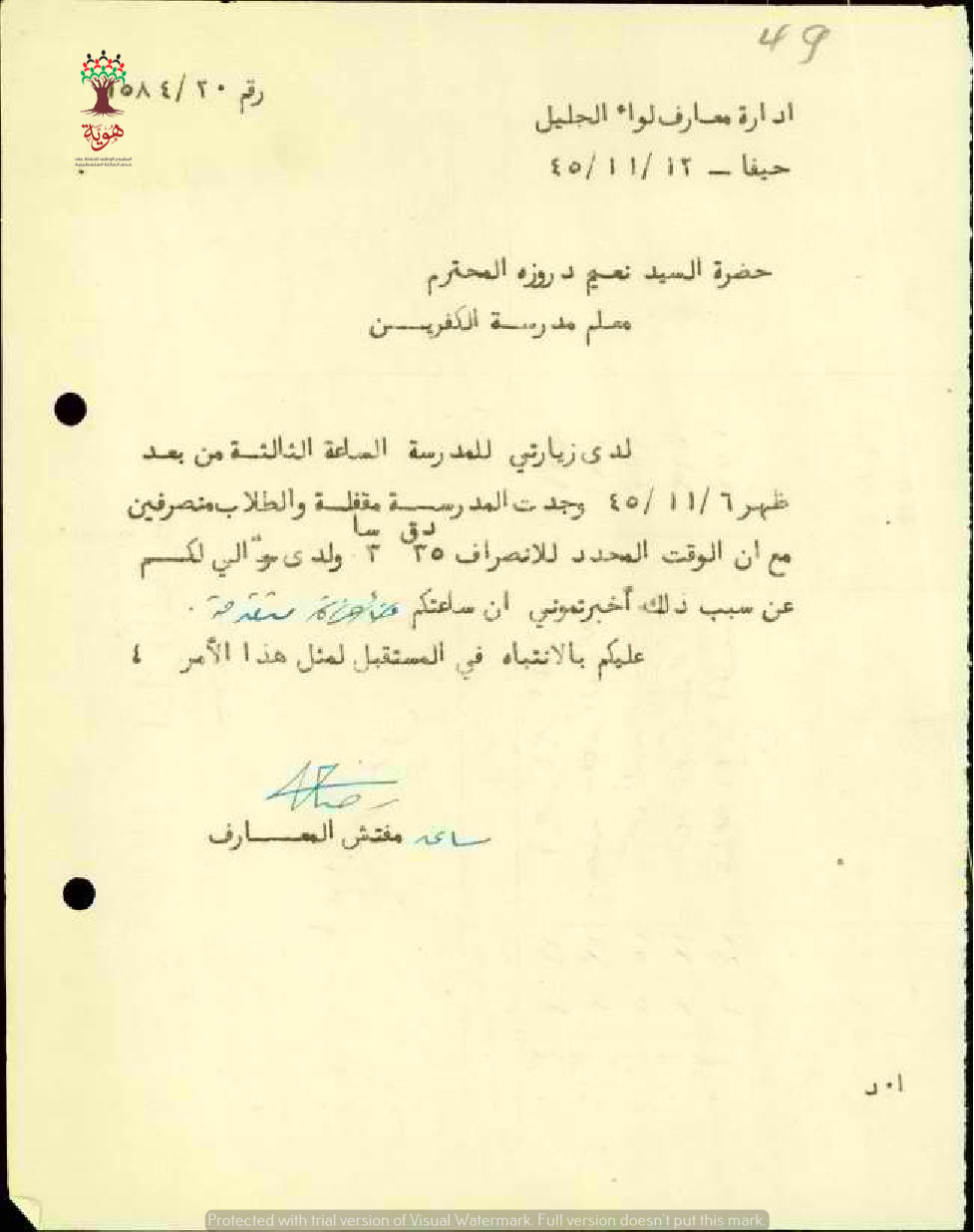 رسالة من مفتش المعارف الى المعلم نعيم دروزة يسأله عن سبب اقفال المدرسة