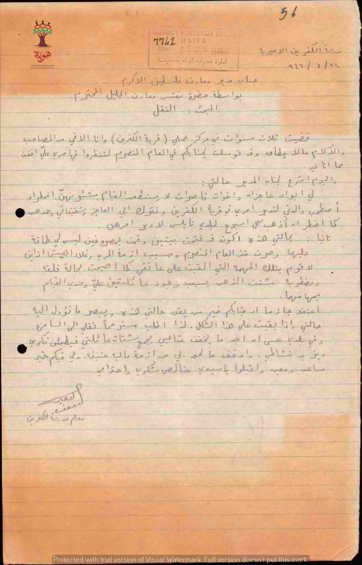 رسالة من المعلم نعيم دروزة الى مفتش المعارف يطلب فيها نقله من مدرسة الكفرين الى نابلس وذلك لأن والداه عاجزان واخواته قاصرات وهو المسؤول عن العائلة.