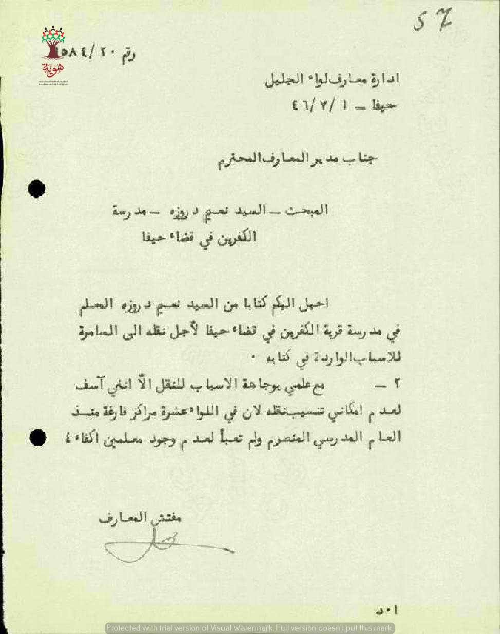 رسالة من مفتش المعارف الى مدير المعارف بخصوص طلب المعلم نعيم دروزة نقله وأنه لا يرى ذلك مناسبا بسبب نقص عدد المعلمين في لواء حيفا.