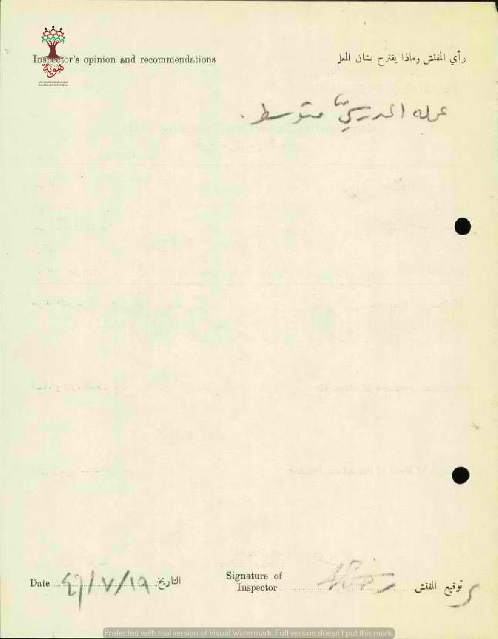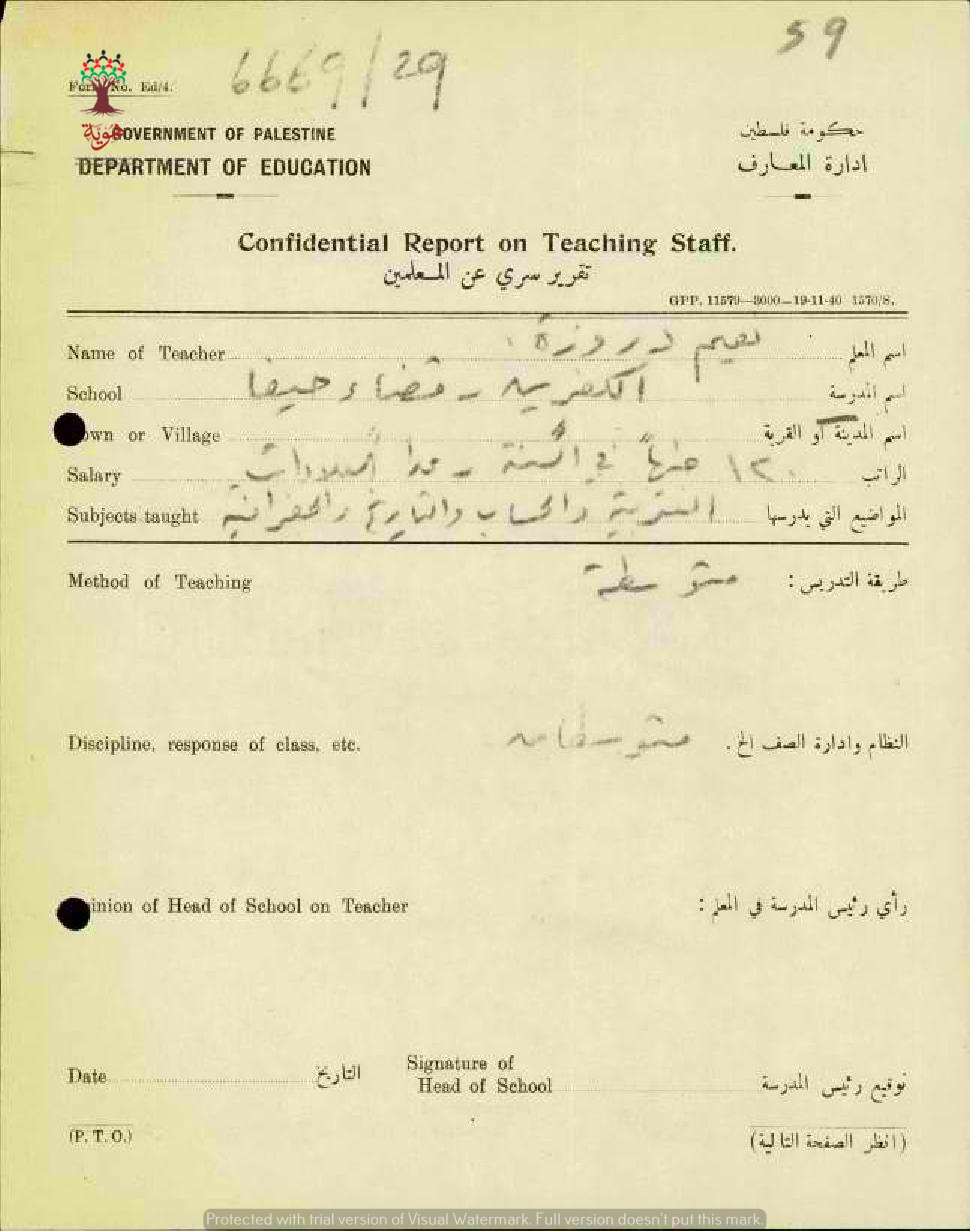 تقرير تفصيلي عن أداء المعلم نعيم دروزة في مدرسة الكفرين سنة 1946