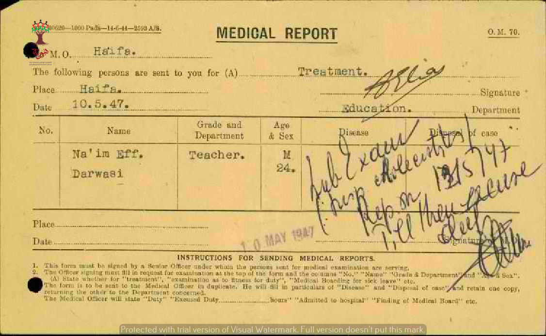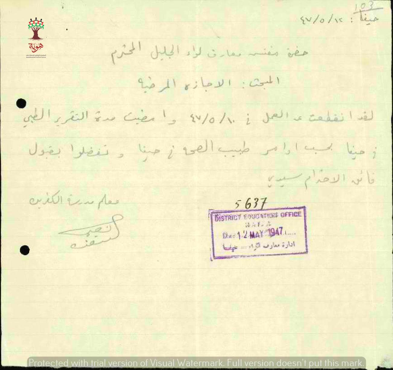 رسالة من المعلم نعيم دروزة الى مفتش المعارف بخصوص تغيبه مرفقة بالتقرير الطبي