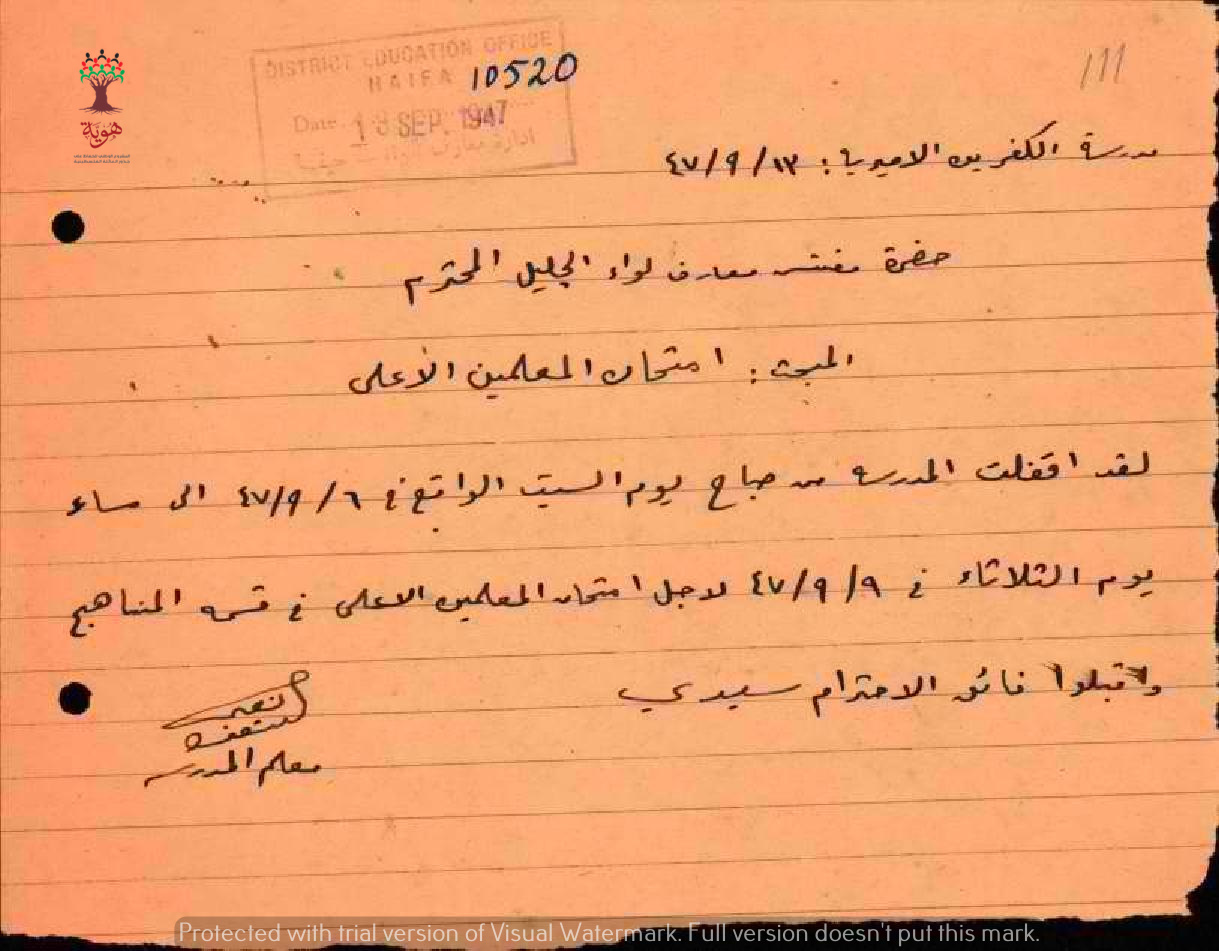 رسالة من المعلم نعيم دروزة الى مفتش المعارف بخصوص اقفال المدرسة من أجل تقديم امتحان المعلمين الأعلى.