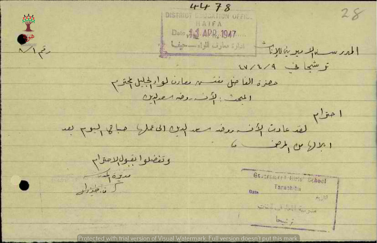 رسالة من مديرة مدرسة ترشيحا الى مفتش المعارف بخصوص عودة المعلمة روضة سعد الدين الى العمل