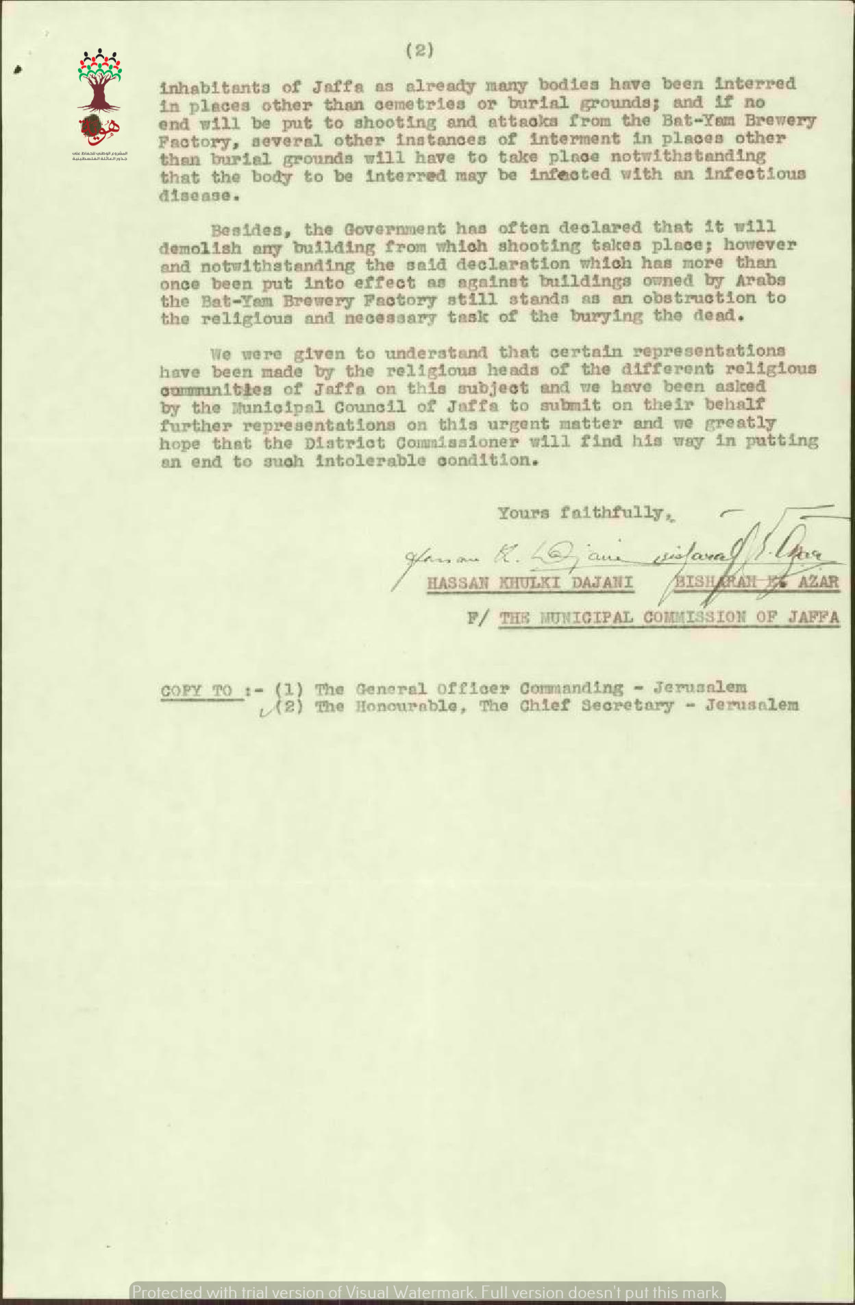 رسالة من اللجنة البلدية في يافا الى مفوض المقاطعة بخصوص مدافن الديانات المختلفة في يافا