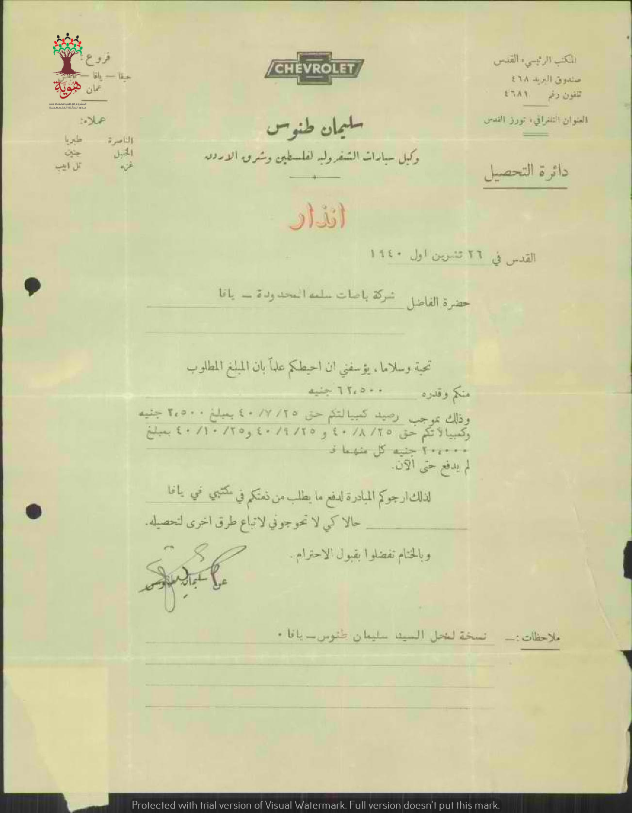 إنذار موجه من سليمان طنوس وكيل سيارات الشيفروليه في فلسطين والأردن الى شركة باصات سلمة لدفع كمبيالة متأخرة.