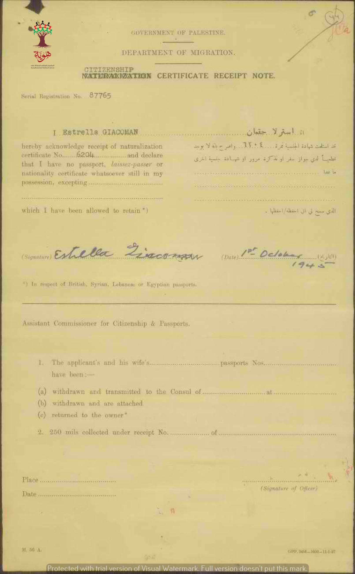 إيصال موقع من استرلا جقمان باستلام شهادة الجنسية الفلسطينية