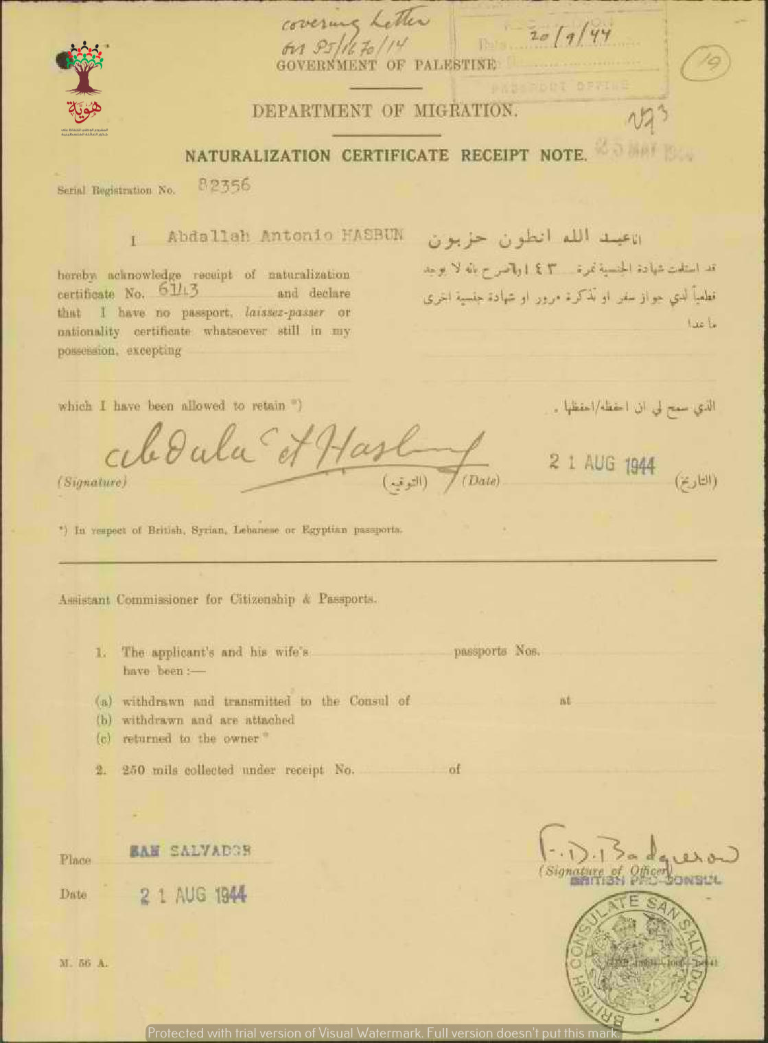 إيصال موقع من عبد الله انطون حزبون باستلام شهادة الجنسية الفلسطينية