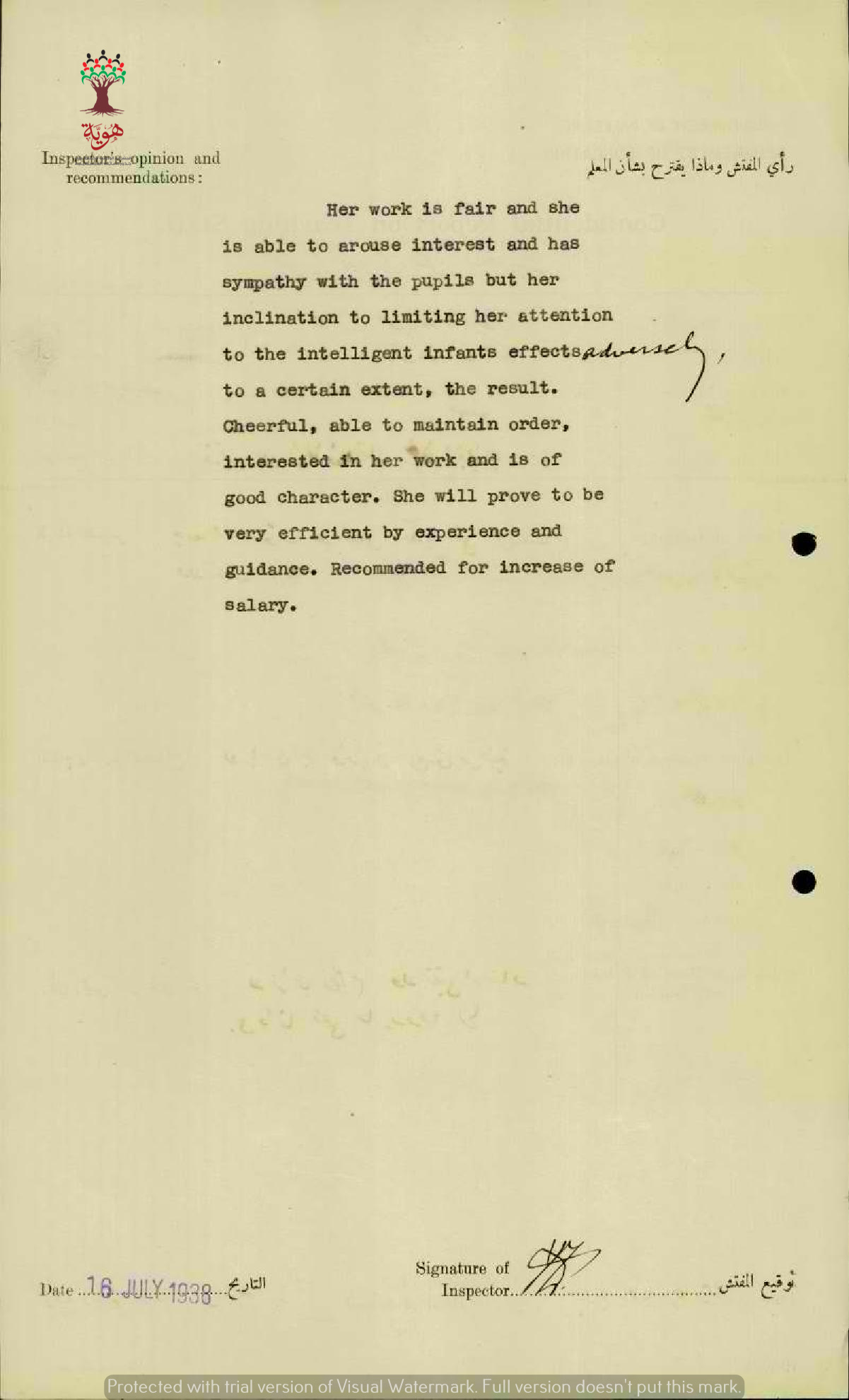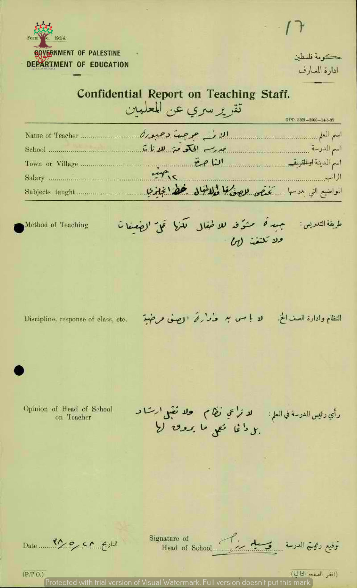 تقرير تفصيلي عن أداء المعلمة جورجيت يعقوب دحبورة في مدرسة بنات الناصرة ستة 1938