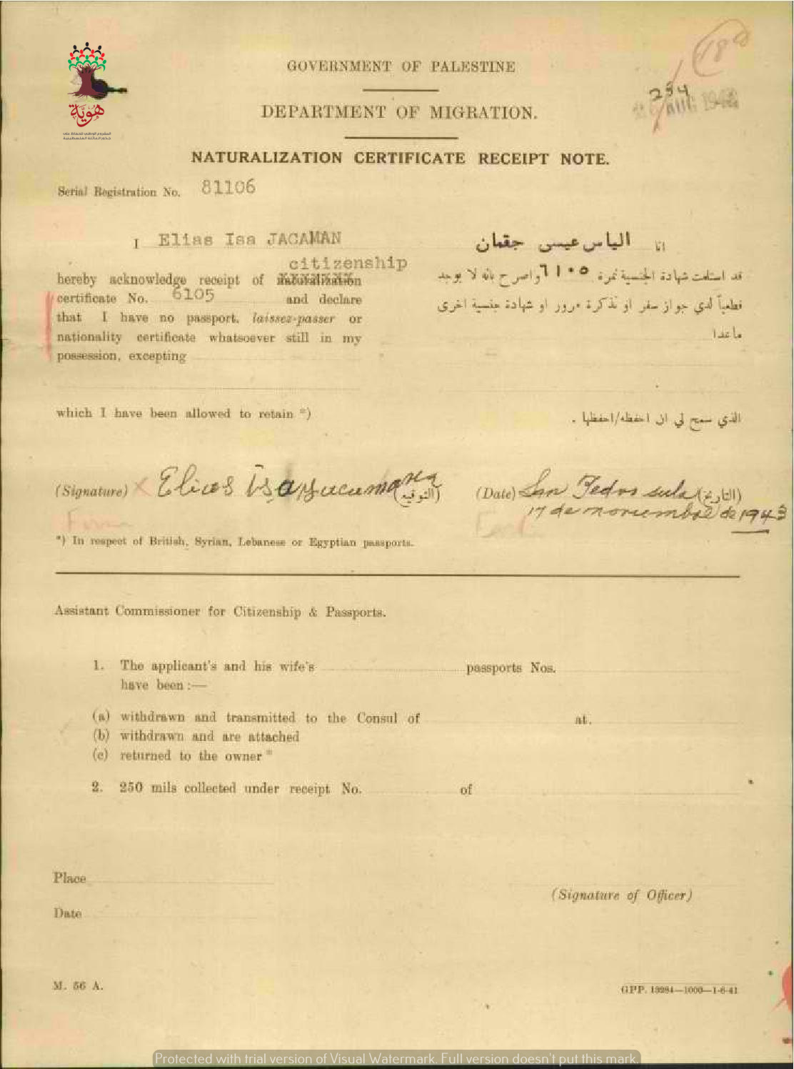إيصال موقع من الياس جقمان باستلام شهادة الجنسية الفلسطينية