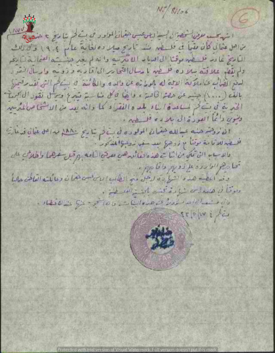 شهادة من المختار للسيد إلياس جقمان بخصوص طلب الجنسية بأنه مواليد بيت لحم وغادر مؤقتا الى الهندوراس سنة 1904
