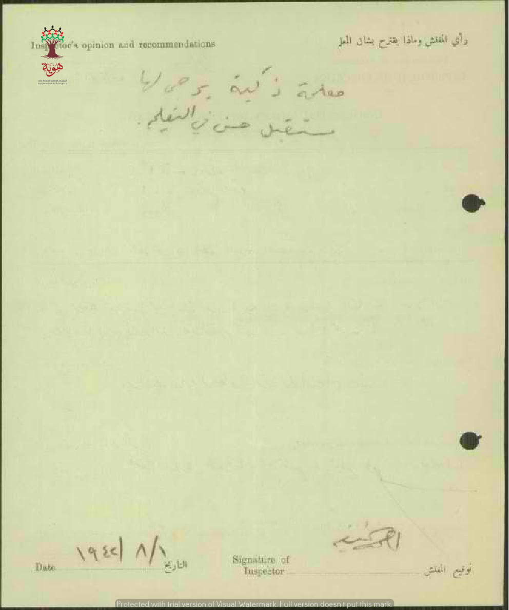 تقرير تفصيلي عن أداء المعلمة يسرى وديع عطا الله في مدرسة بنات بيت لحم سنة 1942