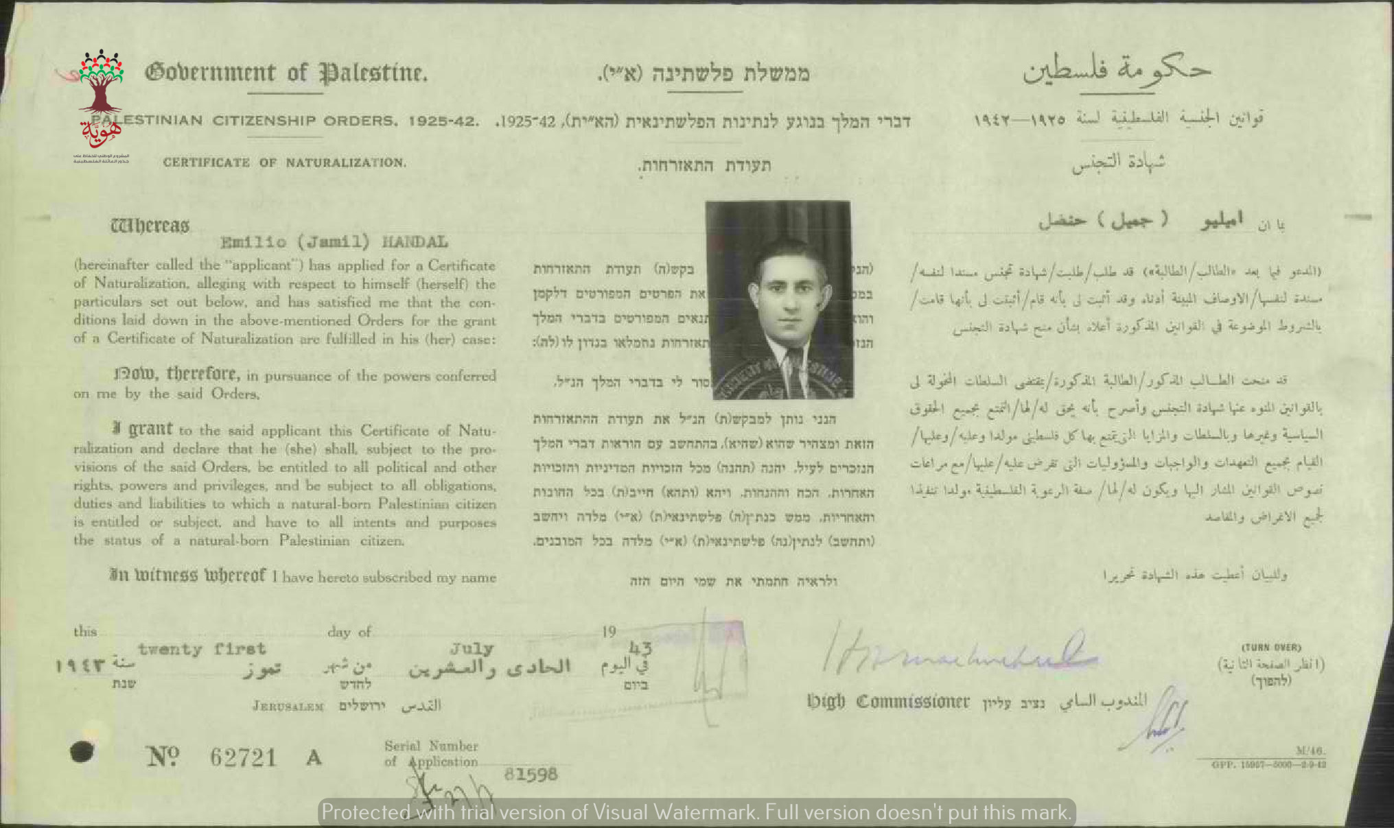 شهادة الجنسية الفلسطينية ل جميل حنضل