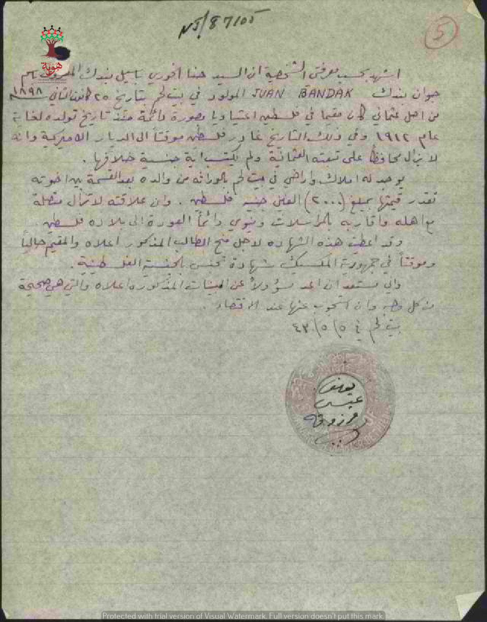 شهادة من المختار يوسف عيسى مرزوقة للسيد حنا البندك بخصوص طلب الجنسية/ بيت لحم