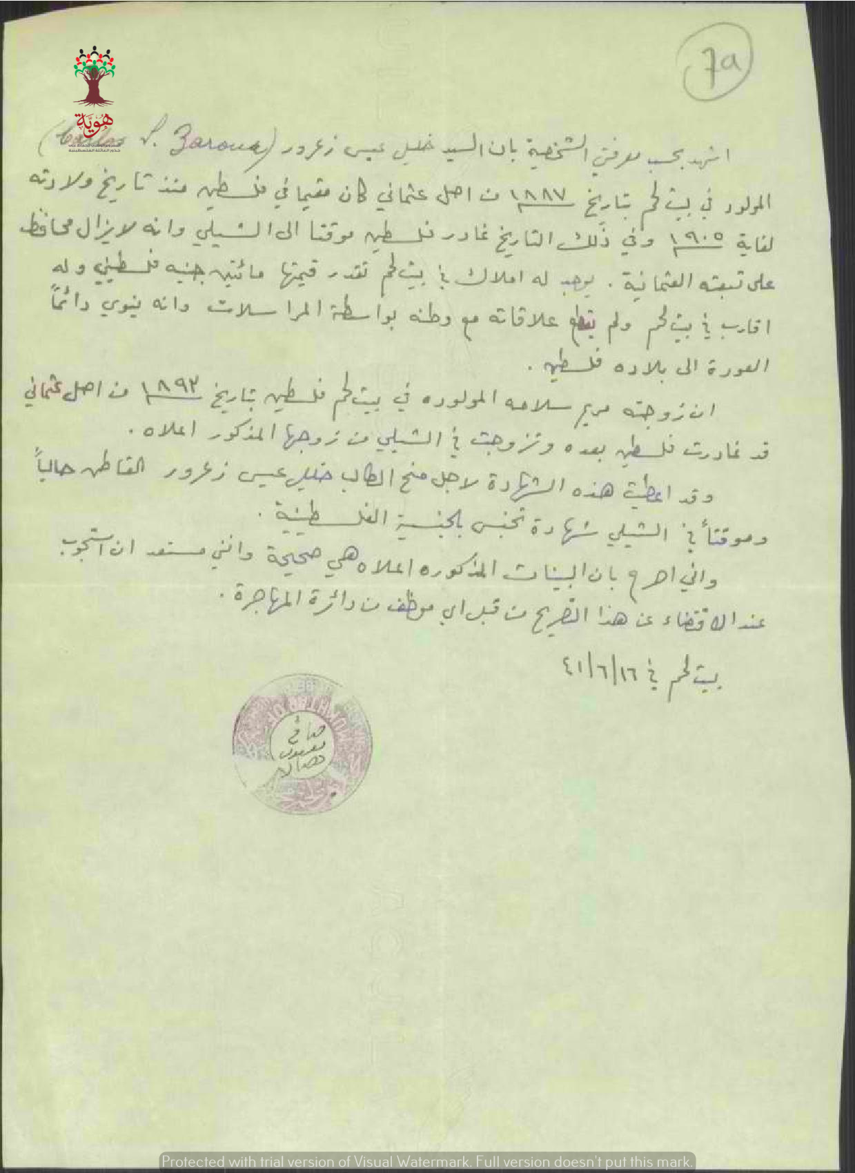 شهادة من المختار للسيد كارلوس(خليل) عيسى زعرور بخصوص طلب الجنسية/ بيت لحم