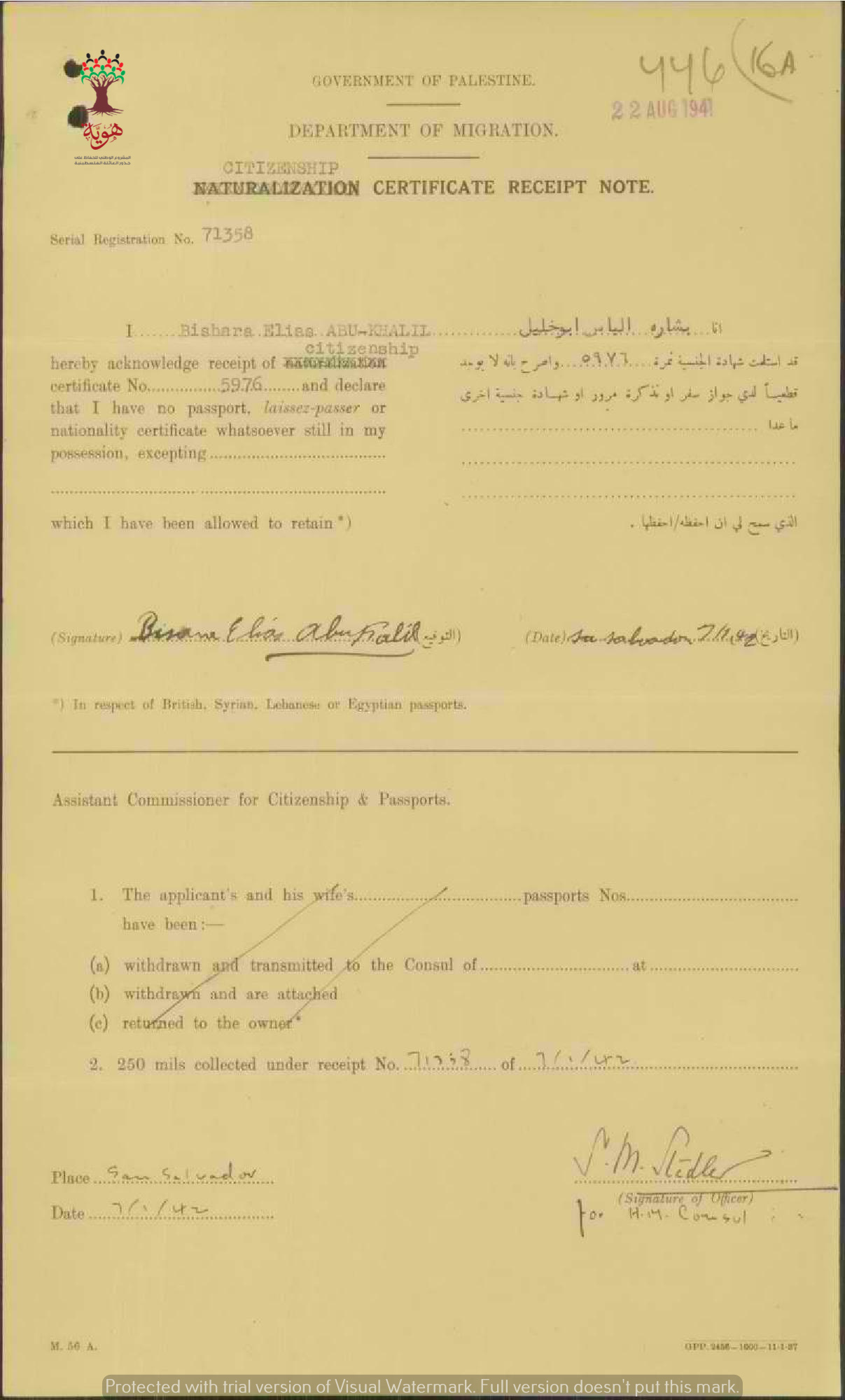 إيصال موقع من بشارة الياس أبو خليل باستلام شهادة الجنسية الفلسطينية