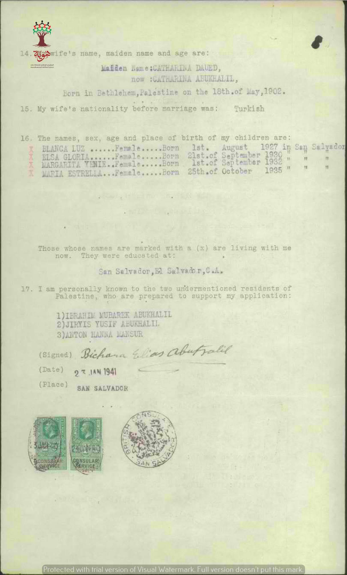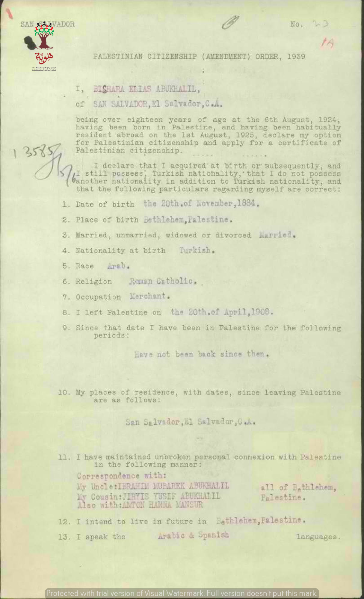 طلب شهادة الجنسية الفلسطينية-بشارة الياس أبو خليل-بيت لحم/السلفادور