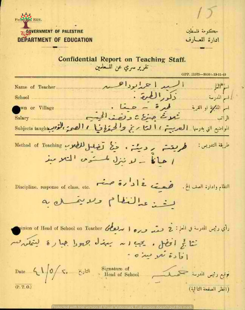 تقرير تفصيلي عن أداء المعلم أحمد عبد الله أبو داهش في مدرسة ذكور الطيرة سنة 1941