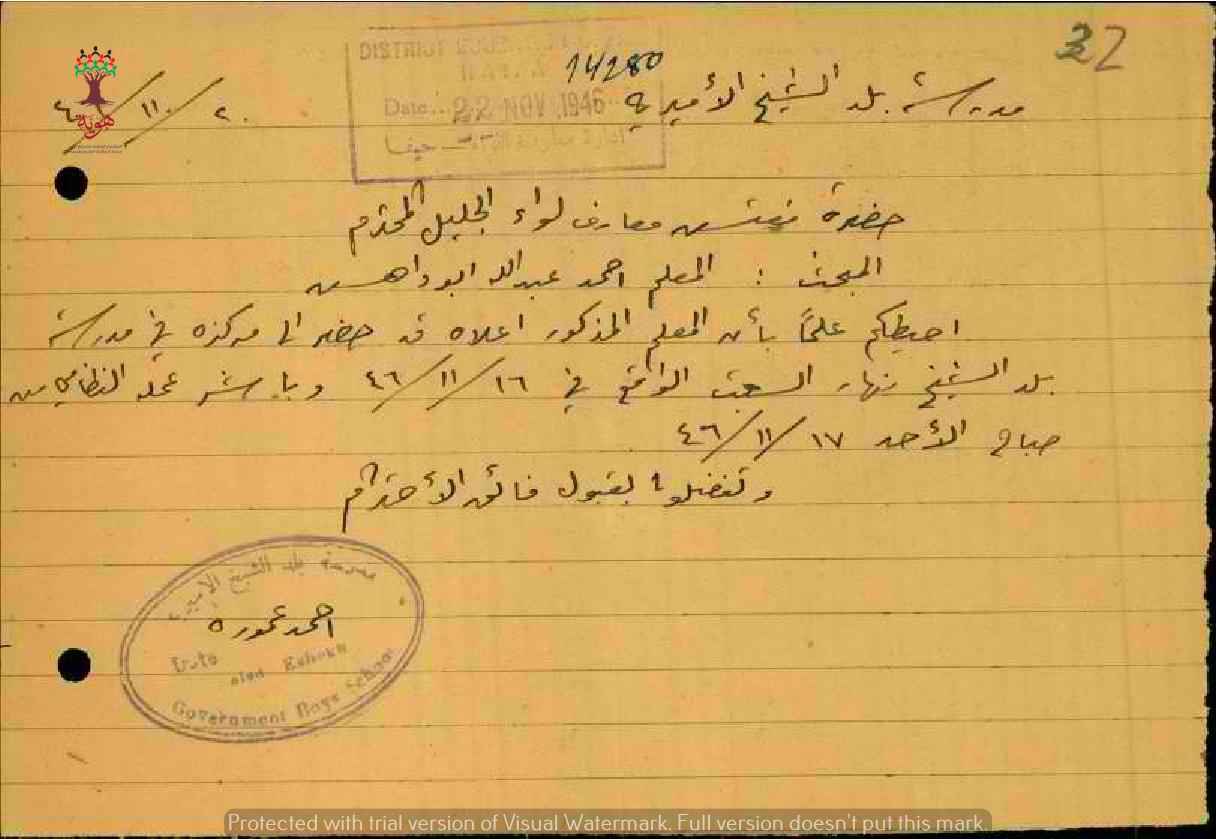 رسالة من مدير مدرسة بلد الشيخ الى مفتش المعارف يخبره بأن المعلم أحمد أبو داهش قد باشر عمله