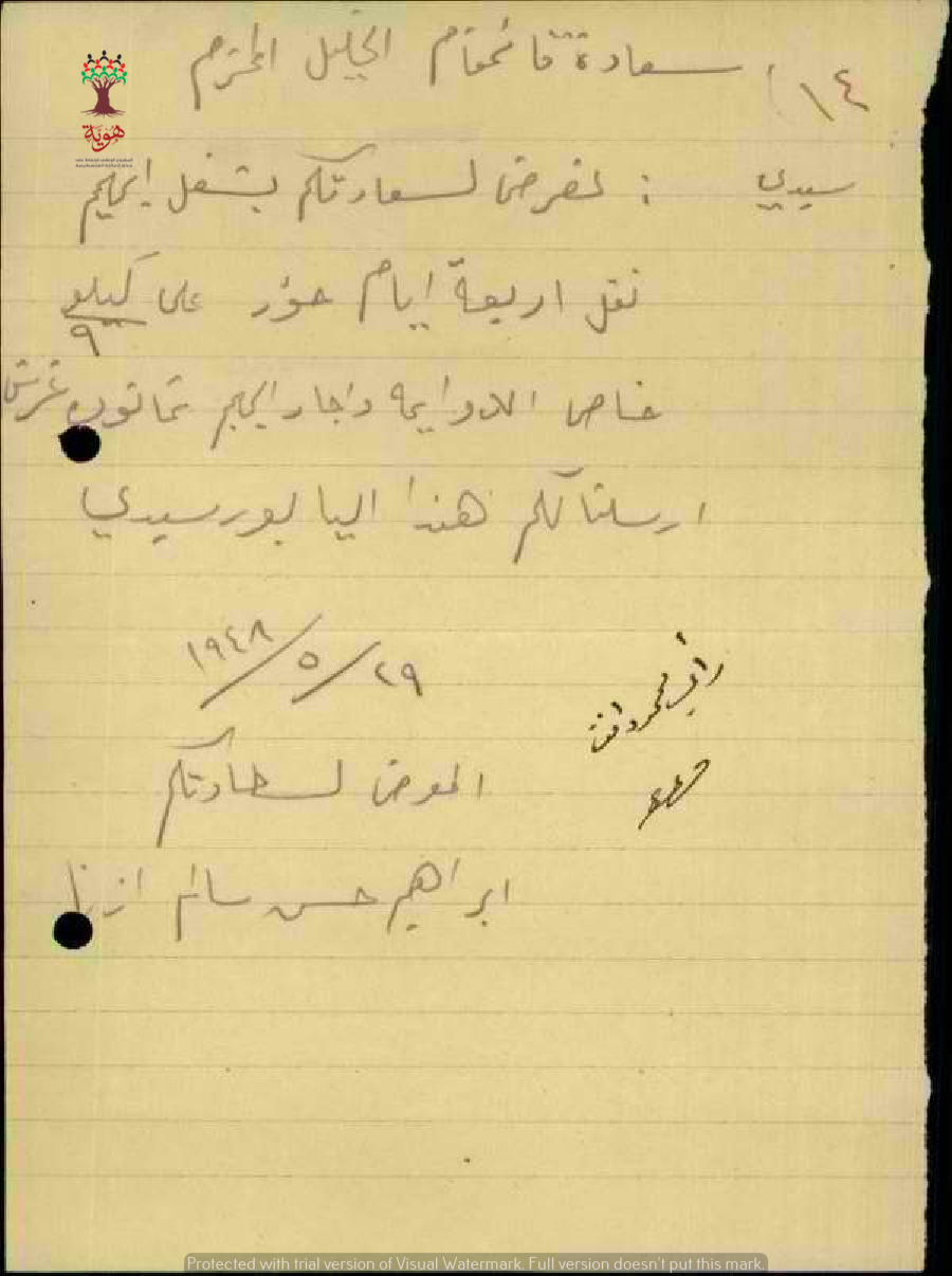 رسالة من ابراهيم حسين الى القائمقام يطلب منه دفع أجرة نقله ل حوز الى طريق الدوايمة لمدة أربعة أيام